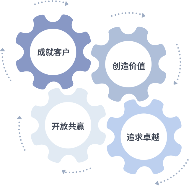 成就客户是一切决策的出发点,,,,创造价值是衡量所有工作的标准,,追求卓越是我们做事做人的态度,,,开放共赢是我们的格局也是最终的结果。。。价值观的齿轮环环相扣,,,推动着组织里的每个人不断向前。。。。